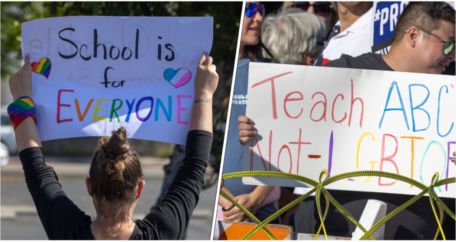 Picture illustration: Demonstrators outside a school board meeting in Glendale, California, on June 20, 2023. (David McNew/Getty Images)